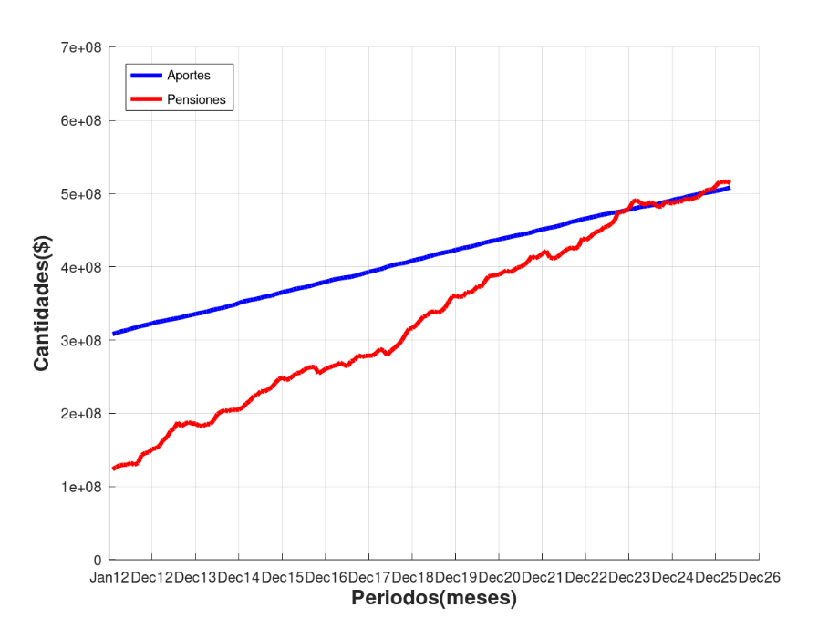 La Figura 2 muestra un acercamiento de la misma simulación por el modelo CMMC, representada en la Figura 1, en la que se puede observar que la sostenibilidad del modelo de pensiones entra en conflicto entre el mes de noviembre y diciembre de 2023.