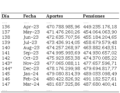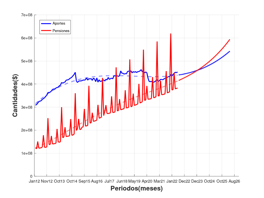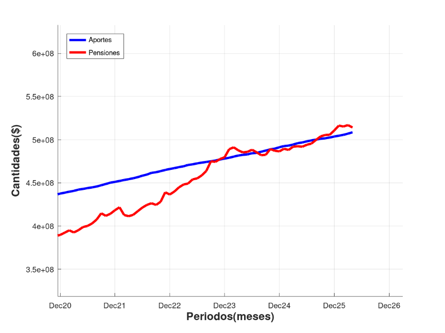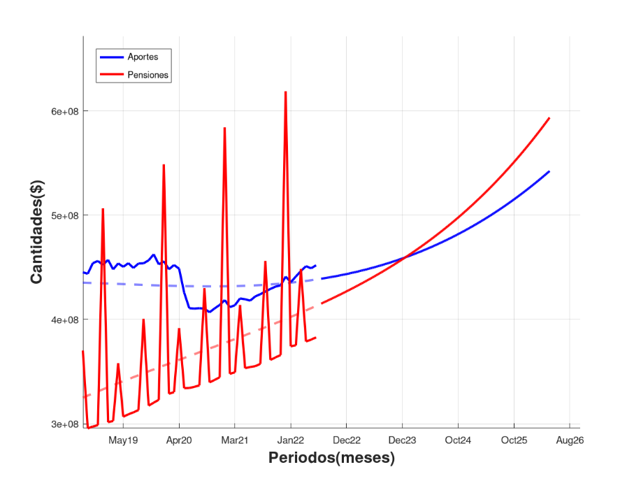 La Figura 4 muestra un acercamiento del modelo generado mediante el método de los mínimos cuadrados, representada en la Figura 3. En ella se observa que la curva de las pensiones supera a la de los aportes entre el mes de noviembre y diciembre de 2023, por lo que el modelo de pensiones se desequilibra en ese periodo.