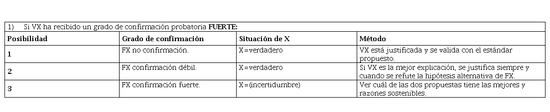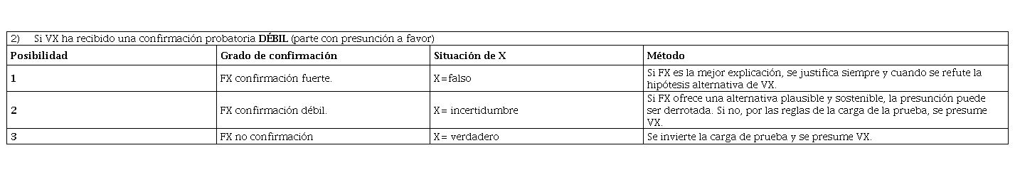 Ahora, para complementar estos criterios, se acompaña la propuesta de Taruffo para verificar los grados de confirmación con las fórmulas de la “probabilidad prevaleciente”. Este método se presenta en el siguiente esquema que pretende demostrar todos los escenarios que el juez puede presentar en su sentencia sobre la base de una situación simple que se pretenda resolver sobre la base de pruebas disponibles.