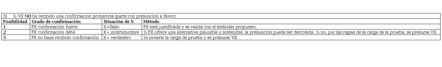 Estos cuadros representan las fórmulas de la “probabilidad prevaleciente”, que sirven de guía para que el juez sepa los escenarios que pueden darse al momento de decidir sobre la vulneración o no de derechos puestos a debate a través de garantías jurisdiccionales, sin que esto signifique un estándar de prueba objetivo en los términos propuestos de Jordi Ferrer.
