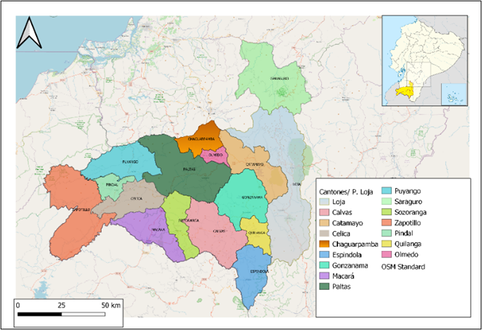 Loja es la novena provincia del país ocupando un territorio de 110666 km.. Limita al noroeste con la provincia de El Oro, al este con la provincia de Zamora Chinchipe, al norte con la provincia de Azuay, al sur con las provincias peruanas de Sullana y Ayabaca y al oeste con las provincias de Zarumilla y Tumbes también pertenecientes al Perú. Está constituida por 16 cantones, con una población de 538.137 habitantes de acuerdo con las proyecciones referenciales 2010-2030 del INEC (2020). A continuación, se expone la composición demográfica por cada una de las unidades administrativas que constituyen el primer nivel de división a nivel provincial.
