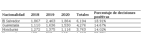 Finalmente, se cruzan datos del periodo 2018-2020 tanto de la Comisión Mexicana de Ayuda a Refugiados como de la Transactional Records Access Clearing House de la Universidad de Syracuse que contempla las solicitudes de asilo en Estados Unidos, para identificar los patrones de coincidencia, tanto en el margen de resoluciones dictadas como en los porcentajes de casos positivos. Lo anterior, con la finalidad de estar en aptitud de llegar a conclusiones a través de una metodología deductiva-analítica.