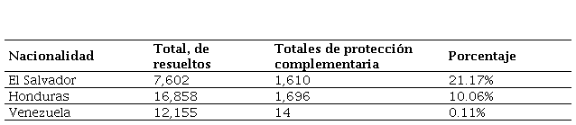 Por otro lado, vale la pena aludir a los resultados emitidos por la COMAR sobre protección complementaria, donde se visualiza la poca aplicación de esta figura hacia personas venezolanas, seguramente porque al tener porcentajes tan altos en la obtención del reconocimiento de refugiados, se vuelve innecesario ejecutar esta medida de protección. Sin embargo, llama la atención que pese a la distancia abismal que existe en el número de solicitantes de refugio entre Honduras y El Salvador, se tengan casi las mismas cantidades de protección complementaria entre ambos países. Toda vez que, como se dijo anteriormente, el otorgamiento de protección complementaria es una medida discrecional de la COMAR, por lo que es cuestionable que se determine que personas salvadoreñas se encuentren en mayor probabilidad de riesgo que la población hondureña, cuando las características contextuales en los terrenos político, económico y social de ambos países son muy semejantes, como quedará demostrado en el siguiente apartado.