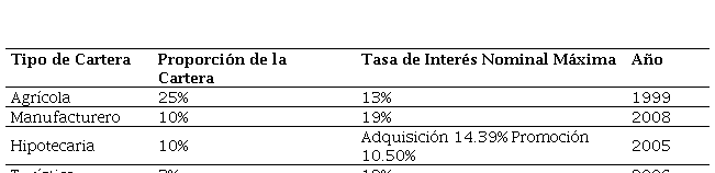 En Venezuela, aunque como dijimos la banca está regulada desde el nacimiento de la Superintendencia (1938) y esto se acentuó con la creación del Banco Central (1940), sin embargo, no es sino hasta los años 70 que se obliga a la banca a tener una proporción de créditos en préstamo agrícola. La misma se fijó en un 8% del total de los créditos y se le fijó una tasa máxima de 13%. Pero a partir de 1999 se introdujeron modificaciones importantes. De acuerdo con lo que puede observarse en la Tabla 1, el 51% de la cartera está regulada. Por consiguiente, solo se dispone de un 49% para otorgar otros tipos de préstamos con los que tiene mayor capacidad de gestionar tasas y plazos para mejorar la rentabilidad del negocio.