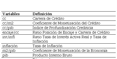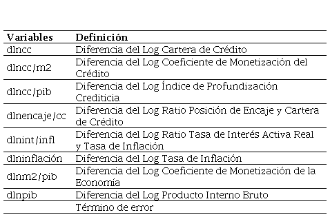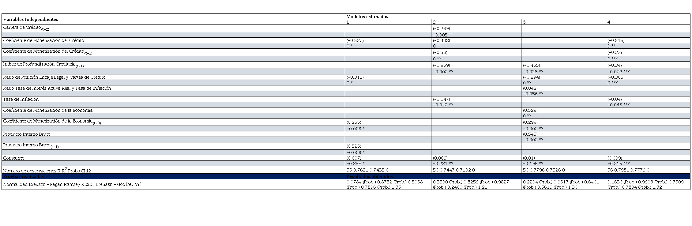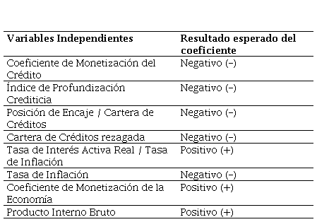 Mientras que las variables explicativas se conforman por: la cartera de créditos rezagada, el coeficiente de monetización del crédito, el índice de profundización crediticia, la ratio entre la posición de encaje legal y cartera de crédito, la tasa de interés activa, la tasa de inflación, el coeficiente de monetización de la economía y el producto interno bruto. Dichas regresiones, recurren tanto a la variable escogida como sus rezagos para explicar el comportamiento de la cartera de créditos.