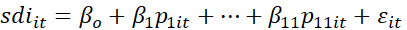 Donde los pilares vienen dados por las variables , que son: instituciones, infraestructura, entorno macroeconómico, educación tanto a nivel básica como superior o universitaria, mercado laboral, tamaño del mercado, tecnología, desarrollo del sistema financiero, dinámica de los negocios e innovación. En el caso del sdi se consideró la incorporación de las variables explicativas por bloques, de manera de evaluar si el nivel de significancia y el signo de la relación se mantiene a medida que se incorporan el resto de las variables de cada dimensión.