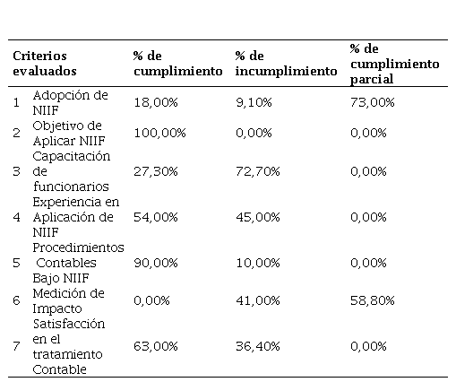 La investigación examinó la aplicación de las Normas Internacionales de Información Financiera (NIIF) en 11 establecimientos de salud en Riobamba, Chimborazo, categorizados como Hospitales y Clínicas (CIIU Q8610.0). Se evaluaron aspectos clave como la adopción, capacitación, experiencia y satisfacción con el tratamiento contable bajo NIIF (ver tabla 2).