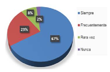 Por otra parte, la categoría de sociedad implica la participación indirecta del resto de los individuos ajenos al núcleo familiar, quienes conforman un grupo que comparte ciertas características y cultura en común. En este sentido, el 67% percibe que la lengua chontal es ampliamente utilizada por los miembros de la comunidad y que es común escucharlo como primera opción de comunicación oral; mientras que el 2% indica que nunca ha escuchado hablar el yokot´an(Figura 2).