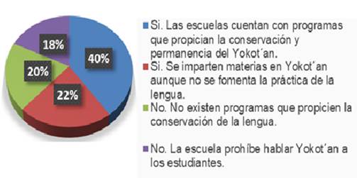Dado que los sujetos de estudio implicados se conforman por jóvenes, se puede asumir que el sistema educativo es un actor importante para propiciar la conservación y la permanencia de la identidad cultural de los chontales. Por lo tanto, un total de 62% opinó que las escuelas cuentan con elementos adecuados para la enseñanza y el aprendizaje y que se imparten materias en yokot´an aunque no se fomenta la práctica de la lengua (Figura 3).