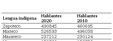 A los pueblos originarios de Oaxaca, la organización a través de la comunidad o desde la sociedad, les ha permitido alcanzar acuerdos mediante asambleas, trabajo colaborativo, dando y recibiendo para el bien común y, sobre todo, transmitir no solo la lengua, sino también costumbres, vestimenta, gastronomía y la forma de vida comunitaria a las nuevas generaciones (Castillo, 2021). La práctica anterior ha logrado preservar la lengua de quienes la practican, manifestando sus resultados en los conteos poblacionales que se realizan cada diez años en el país. En la tabla 1 se puede encontrar las lenguas que se han preservado, el número de hablantes y año del censo.
