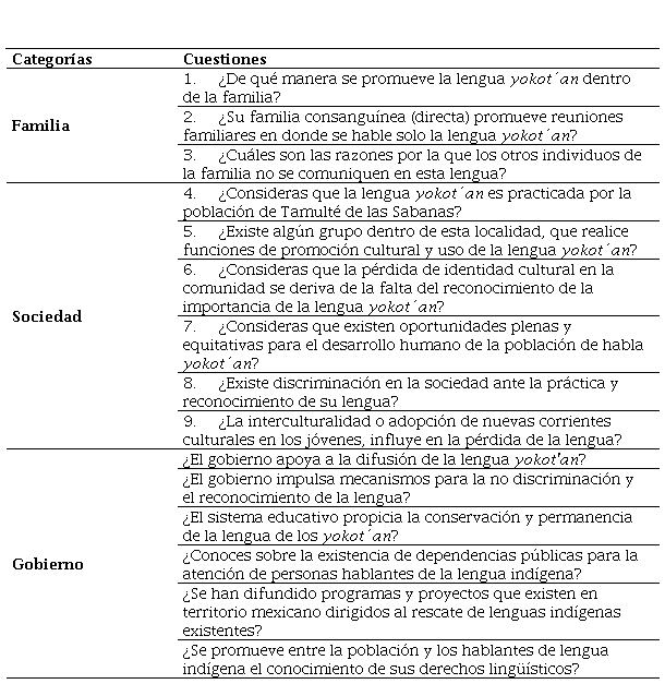 Por lo anterior, el estudio pretende establecer el nivel de prestigio de la lengua como medio de comunicación a partir de la importancia que la familia, la sociedad y el gobierno le otorgan, desde la percepción de los jóvenes residentes de Tamulté de las Sabanas. Las preguntas que sirvieron de guía en la investigación fueron: ¿cómo influye la familia en la preservación de la lengua y cultura yokot´an de los jóvenes?, ¿qué participación tienen los actores de gobierno en el fortalecimiento o fomento de las manifestaciones culturales de la población? y, ¿qué acciones destinadas a impulsar el arraigo de las tradiciones a través del tejido social se han observado en Tamulté de las Sabanas?