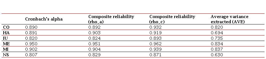 La primera fase se evaluó la fiabilidad de los instrumentos utilizados mediante el coeficiente alfa de Cronbach. Este coeficiente mide la consistencia interna de los ítems de una escala, y un valor superior a 0.7 indica una alta fiabilidad. Además, se utilizaron otros índices para evaluar la fiabilidad del modelo, incluyendo la ρ_A de Dijkstra y Henseler (2015) y la ρ_C de Jöreskog (1971) (Guanaquiza-Leiva et al., 2022).