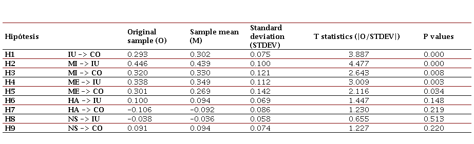 La prueba de hipótesis en el análisis de resultados se centra en evaluar si las relaciones propuestas entre variables en el modelo son significativas. En la segunda fase del análisis, se ha aplicado un enfoque en dos aspectos principales: primero, la prueba de hipótesis y, segundo, el análisis de la capacidad predictiva del modelo. Para llevar a cabo la prueba de hipótesis, se utilizó la técnica estadística no paramétrica de Bootstrapping. Este método permite estimar la significancia de los parámetros del modelo al calcular el valor p asociado a cada hipótesis. El valor p representa la probabilidad de obtener los resultados observados si la hipótesis nula fuera cierta. Para aceptar una hipótesis, el valor p debe ser inferior a 0.05 (Razak et al., 2018).