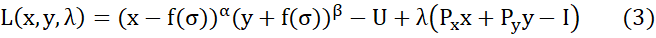 Las ecuaciones (13) y (15) representan las soluciones óptimas para las cantidades consumidas de los productos 1 (𝑥) y 2 (𝑦), respectivamente, considerando la influencia del factor de la función de sesgo 𝑓(𝜎), la cual actúa como un modulador de la utilidad percibida. Sin embargo, en esta etapa del modelo aún no se conoce la forma funcional exacta de 𝑓(𝜎), lo que impide calcular de manera precisa los valores óptimos de consumo.