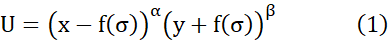 Dado que durante la recopilación de datos se informó a los participantes que los productos evaluados eran similares en características, en el modelo de utilidad se asume que los factores de peso 𝛼 y 𝛽 tienen el mismo valor. Por lo tanto, la función de utilidad planteada para evaluar el modelo matemático estará descrita por: