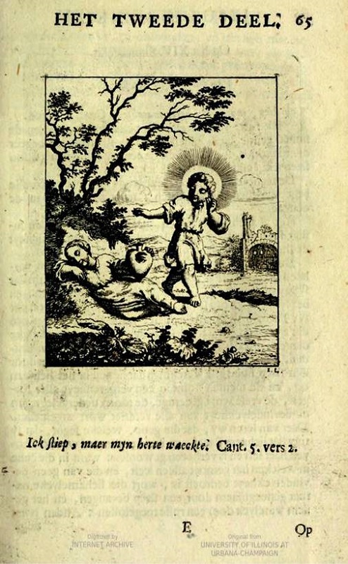 El texto en prosa que sigue al pasar la página lleva el título Op het XIV. Sinnebeeldt y el subtítulo Van het waken des Geestes (“Sobre la vigilia del Espíritu”, fig. 4). Éste es una continuación del tema dado por el poema, los versos bíblicos y la imagen. Inicia con una descripción del reposo de lo mundano y el deseo de lo que está por venir, de tal manera que el Alma duerme mientras el corazón vigila: “La carne debe dormir, la fe debe vigilar: los deseos del cuerpo deben dormir, la prudencia del corazón debe ser vigilante.”41 En la reflexión que sigue, Luyken presenta a los santos como modelos, y establece que no duermen por pereza, sino porque la carne lo exige. Duermen de lo que es transitorio, y con su verdadero ser observan lo eterno. El sueño, indica Luyken basándose en una larga tradición, es lo más cercano a la muerte, a la muerte del cuerpo mortal; la vigilia del corazón es lo más cercano a nuestro verdadero cuerpo o ser, libre de la carne. El Alma, despierta y vigilante, es conducida por lo divino a su ser más elevado justo ante la recámara del Rey Eterno. El Alma exaltada, abrazando su más íntimo ser, llega a sentir en esta amorosa fuerza una corriente que viene del Espíritu Santo, como una fuente viva que vierte dulzura eterna. Al estar tan arriba en la luz, tiene todos sus sentidos anulados, y el simple ojo se abre en el reino de la fuerza amorosa. Este ojo, contemplando con claridad espiritual, ve todo lo que Dios Es. Pero cuando el Alma vuelve a sí, se percata de que esta experiencia es imposible de expresar con palabras, y no es fácil de comprender o, en todo caso, confesar.42
