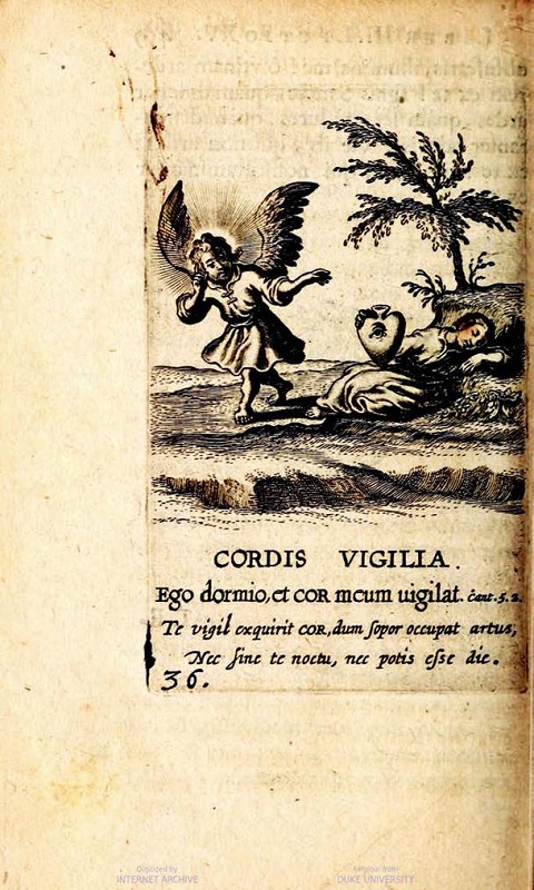 Luyken utilizó como parte de sus fuentes visuales y textuales libros de emblemas católicos tales como Amorum Emblemata (1608) y Amoris Divini Emblemata (1608) de Otto van Veen; Pia Desideria (1624) de Herman Hugo;24 y Regia via Crucis (1635) y Schola Cordis (1629) de Benedictus van Haeften.25 Las obras de Van Veen proporcionaron un claro modelo para construir el texto en torno a la celebración del amor entre Cristo (Amor Divinus) y el Alma, basándose en interpretaciones alegóricas del Cantar de los Cantares.26 Por otra parte, Pia Desideria prefigura la estructura básica respecto de la vía mística seguida por Luyken. Finalmente, la importancia de Van Haeften radica en proveer modelos visuales directos para el libro. El Cordis Vigilia del Schola Cordis es el precedente del grabado que Luyken elaboró para el Emblema XIV (fig. 2).