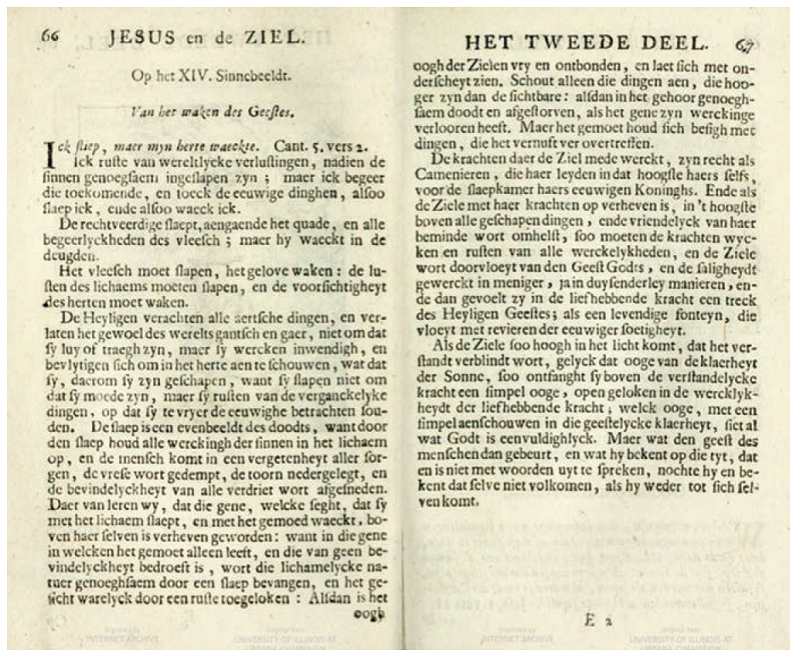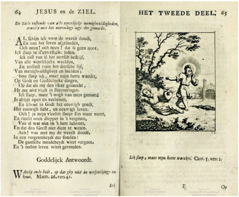 En 1678 el editor Pieter Arentsz publicó la primera edición de Jesus en de Ziel, de Jan Luyken, uno de los artistas más prolíficos en la República Holandesa. En total, Jesus en de Ziel tuvo diez ediciones, desde finales del siglo XVII hasta finales del XVIII.19 El libro fue una publicación crucial para la entrada del motivo clásico de Eros y Anteros20 en los emblemas de amor religioso producidos en la República Holandesa.21 Como Barbara Lewalski señala, las figuras de Eros y Anteros fueron reubicadas como alegorías de un peregrinaje espiritual del Amor Celestial y el Amor Terrenal, el Amor Divino y Anima y, por supuesto, de Jesús y el Alma.22 Lewalski describe sucintamente este viaje como “el progreso del alma en ruta a la salvación de acuerdo a las tres etapas tradicionales de la vía mística-purgativa, iluminativa, unitiva”.23