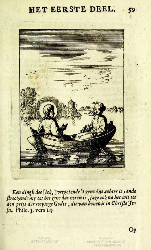Podemos delinear al menos dos formas básicas de leer lo que sucede en la imagen del Emblema si tomamos en consideración que el usuario en el que estamos interesados es uno que consumiría la imagen como parte de su interacción con el libro. En el primer escenario la imagen se aborda desde el punto de vista de la narración de la obra en su conjunto. Aquí, el lector sigue la historia expuesta por Luyken que he descrito brevemente. Tomemos el Emblema XIV. Si el lector sigue el orden del libro en secuencia, entonces es evidente que el emblema funciona como transición e introducción: es el primero de la segunda parte de la obra, y, por lo tanto, también se relaciona en cierta medida con la conclusión de la primera parte, la cual pertenece al Emblema XIII (fig. 5). En este último vemos al Alma enfrentada, con la ayuda de su amado (Jesús), a una vida pecaminosa, cansada de ver cómo la lujuria en el mundo trata de derrotarla. Esta circunstancia está representada por el Alma y Jesús en una barca en el mar. El poema cuenta cómo los dos tratan de llegar al otro lado, remando contra la corriente de pecados del mundo. La respuesta divina da seguridad en cuanto a la meta: “Mas el que perseverare hasta el fin, éste será salvo” (Mateo 24:13).44