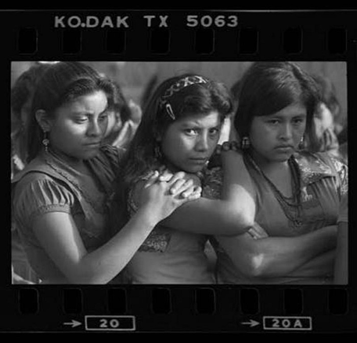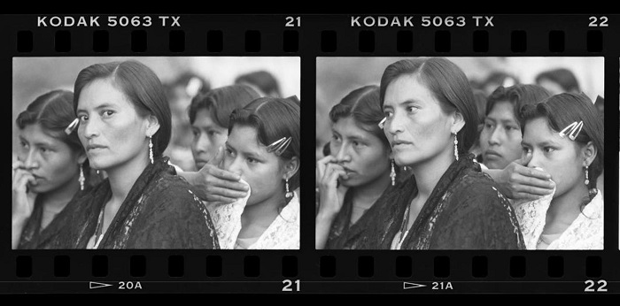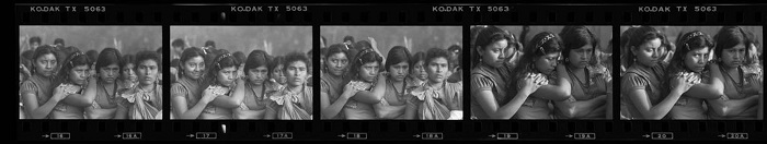 Llaman la atención dos fotos del grupo de mujeres que figura en la hoja de contactos, pues fue el negativo 21 el más remarcado para efectos de edición. La imagen en cuestión es un retrato certero a cuatro mujeres indígenas, una de las cuales regresa la mirada de soslayo -entre desconfiada, curiosa y orgullosa a la lente-, mientras que sus otras compañeras dirigen su mirada hacia el lado contrario (fig.10).