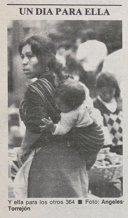 Para 1990 el periódico mantenía vigente la propuesta a la que se sumarían las fotografías de Angeles Torrejón, remitiendo en ciertas ocasiones a temas relacionados con la maternidad. Es posible apreciar un ejemplo de ello en una fotografía publicada en la contraportada del diario con motivo del 10 de mayo de 1990, en la que se observa a una madre de rasgos indígenas cargando a su espalda a su pequeño hijo (fig. 2).