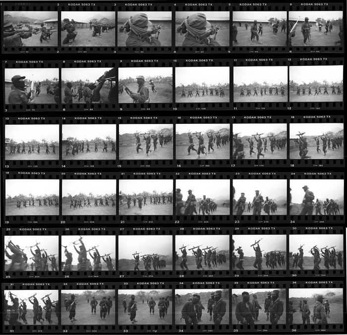 Las secuencias del negativo 2 al 10 evidencian el registro llevado por Torrejón, quien retrató inicialmente la lectura de un comunicado hecha por un mando militar rodeado por su tropa y unos músicos. En un primer momento realizó tomas generales, pero en los negativos subsecuentes (11, 12 y 13)optó por encuadres cerrados: enfocó a un miliciano en contrapicada, cuya postura, en estado de alerta y con el fusil de asalto en ristre, permite apreciar el entrenamiento y la disciplina inculcada por los oficiales.