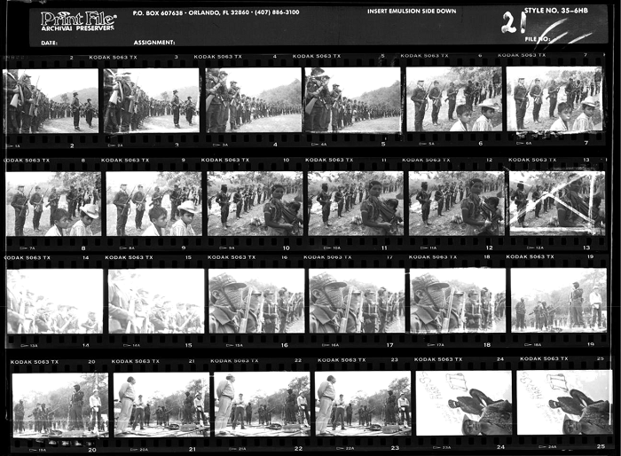 Otra fotografía emblemática realizada por Torrejón la encontramos en la hoja de contacto número 13, correspondiente a fotos tomadas también del 26 de abril al 15 de mayo de 1994; ahí apreciamos una asamblea en la que un grupo de milicianos realiza la lectura de un mensaje.
