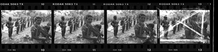 La búsqueda documental y estética de la fotógrafa dentro del campamento miliciano la sintetizó en una de sus fotografías que, al paso de los años, se volvió icónica en su obra. En este caso la hoja de contacto número 21 nos permite apreciar el proceso creativo de la imagen seleccionada, en la cual aparece en primer plano una madre indígena y, de fondo, la formación militar (fig. 6).