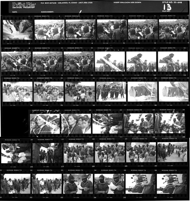 Aun cuando en el resto de los negativos presenta primero encuadres más cerrados a la fila de insurgentes y tomas de un encuentro entre Pablo Gómez y el subcomandante Marcos, la fotorreportera ya había capturado material de ese evento para su proyecto documental, y el resto lo resguardó para integrarlo a un tema informativo.