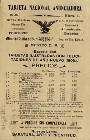 Por otro lado, las fotografías disminuyeron sus costos y el público consumidor se diversificó incluso hacia la clase media-baja, al menos entre los costos de las postales podemos ver que éstos variaban según el tema y la técnica, como se aprecia en la postal anunciadora (Fig. 1).