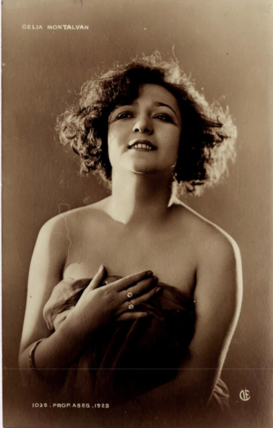 Esta hipótesis se comprobó con imágenes como las de Celia Montalván (Fig. 5), donde se muestra parcialmente desnuda de los hombros, mientras el resto de su cuerpo está cubierto por una manta. En la parte superior izquierda aparece su nombre y se constata, de igual manera, que el cuerpo no se expone por completo a la mirada del espectador; por el contrario, se establece únicamente un juego en el cual se sabe que está desnuda bajo la manta, mas nunca se hace explícito.