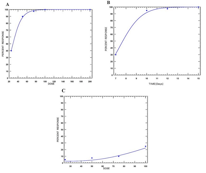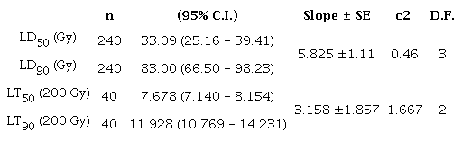 Another important factor to stand out in the face of this difference in values is related to the dose rate, because the higher the dose rate, the faster the irradiation process and the greater the effect induced by radiation on biological systems [20], decreasing the probability of recovery of somatic cells. Fontes et al. when studying different dose rates to control Callosobruchus maculatus (Fabr.) observed that when applying a high dose rate of 1418 Gy/hour the letal dose was less than 25 Gy, while on a low dose rate of 55 Gy/hour the lethal dose had a fourfold increase, corresponding to 100 Gy [21].