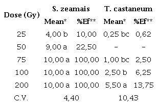 Gamma radiation is an important strategy for the control of stored grain pests. The dose of 75 Gy was enough to obtain 100% efficiency for S. zeamais but the dose of 200 Gy did not reach satisfactory efficiency to obtain 100% of control for T. castaneum. Therefore, a dose of 400 Gy should be recommended for the control of these two insect species in their respective substrates.