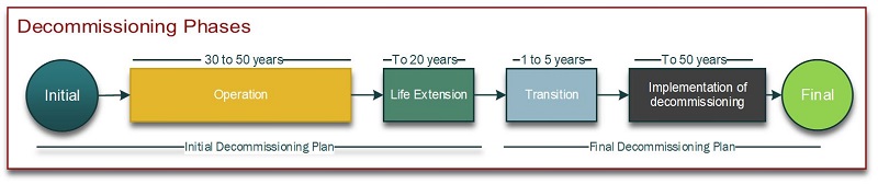 For nuclear reactors, decommissioning is the final phase of the life cycle after construction, commissioning, operation, transition, and shutdown. It is a process that involves a wide range of technical (decontamination, decommissioning, radioactive waste management) and administrative (financial resource management, human resources, and knowledge management) activities, always considering the protection of health, safety, and of the environment.