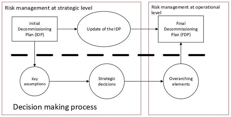 Thus, the RMSL is linked to the IDP, which after many years, will be transformed into an FDP, which will be related to the RMOL. In this way, RMSL will accompany the transformation process up to RMOL. Figure 2 illustrates the evolution of the decommissioning plan and the relevant aspects for risk management.