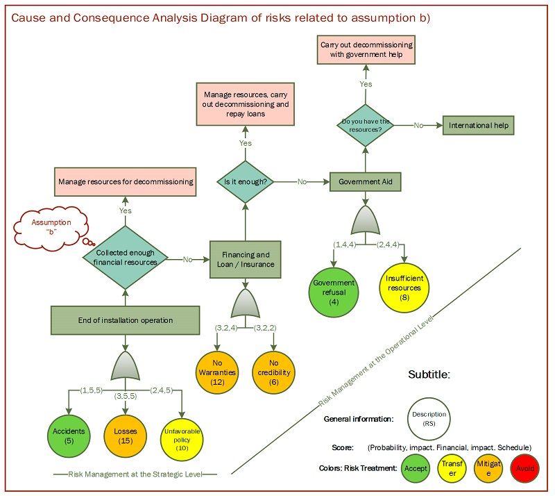 At this point, the company will be able to request financial loans from creditors (Banks, Funds, etc.), and place the company's assets as collateral to obtain the additional resources necessary to complete the decommissioning. Although, they can also obtain funds from governmental financial institutions, these may not yet be sufficient to carry out the decommissioning. In Brazil, nuclear facilities may not have sufficient guarantees for creditors to provide the necessary resources, as the Brazilian nuclear area is still maturing. In this sense, the Government, which has the monopoly of nuclear activities in Brazil, must provide the guidelines and provide means to supply the decommissioning funds, as well as protect the activities in case of bankruptcy or lack of resources. An alternative is for the Brazilian Congress to legislate to encourage the creation of insurance to cover eventual decommissioning needs. In the USA, for example, a Law (Price-Anderson) was created that guarantees coverage for possible losses for personal and material damages caused by NPP accidents in the American territory, and which also allowed the creation of insurance for decommissioning [7]. In view of the information mentioned above and to simulate the probabilities and consequences, Figure 3 shows the cause and consequence analysis diagram of the risks. Indicating the risk level (defined by the author), using the criteria described in reference 3.