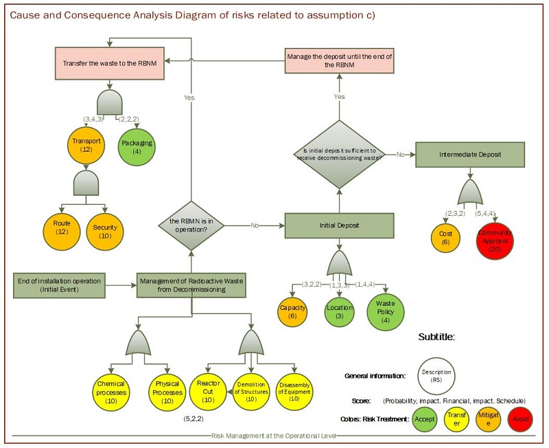 Although there may be a series of risks associated with the management of radioactive waste, in this work, as a way of exemplifying the use of risk assessment process techniques, the risks associated with assumption that the RBMN or intermediate or final deposits will be operational and will have sufficient capacity for all types of radioactive waste produced during decommissioning (assumption 'c' cited in chapter 3) will be analyzed. These risks are described in the analysis presented in Figure 4.