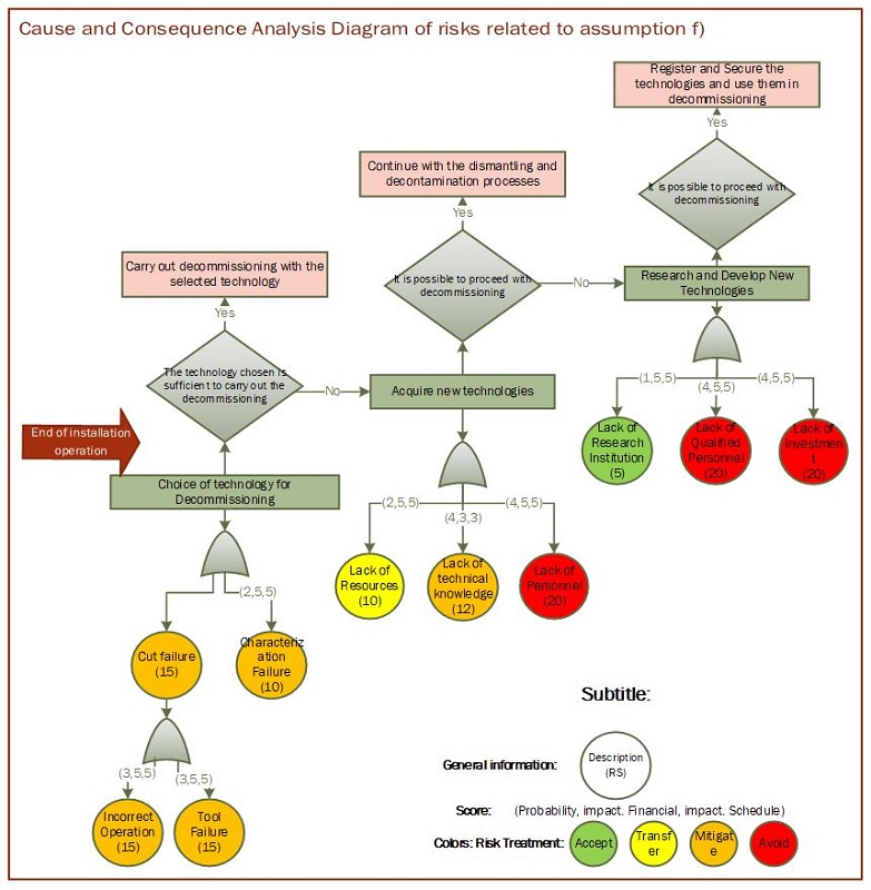 In view of the above, it is possible to analyze several risks that may be associated with the technology, in order to exemplify one of the possible risks, the risk described in the assumption that the proposed decommissioning technologies will be sufficient for the actions of dismantling and decontamination safely (assumption 'f' cited in chapter 3). This risk is cited in Figure 6, that illustrates the analysis performed by the author.