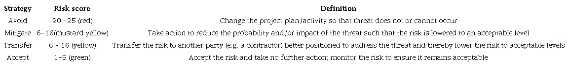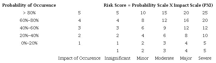The Risk Score (RS) is determined through the product of the highest value probability and impact scores (probability x impact). For example, a nuclear accident risk is very unlikely to happen, less than 20% (score = 1), but the financial impact, if it does occur, is high, above 20% of the budget (score = 5) and suppose that the schedule is affected by between 11 and 20% of the remaining duration (score = 4). The RS for this example will be 5 (1 X 5), as the choice of impact, following practice, will always be based on the highest value [3].