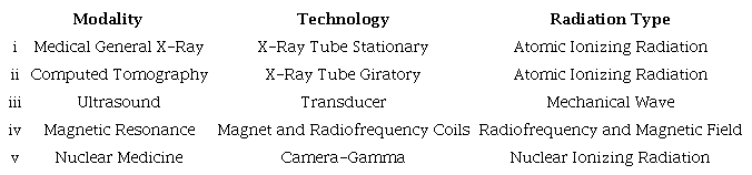 According to the Brazilian College of Radiology and Diagnostic Imaging (CBR) the definition of the diagnosis of COVID-19 will be confirmed by clinical-epidemiological information added to RT-PCR and/or serology tests. Additionally, imaging diagnostic methods will be properly used as a diagnostic complement [6]. The main modalities used for different clinical indications related to COVID-19 are Medical General X-Ray (XR); Computed Tomography (CT); Ultrasound (US); Magnetic Resonance Imaging (MRI); and Nuclear Medicine (NM). Table 1 presents a summary of these technological imaging modalities.