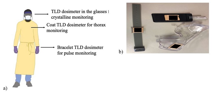 The dosimetry of two OEIs (biomedical staff) was measured during a period of five months. Both of them used two sets of TLD (thermoluminescent dosimeters) for pulse, whole-body and crystalline: one set for PET/MRI, and the other set for PET/CT studies, respectively (see Figure 1 ). The set of dosimeters were monthly renewed and the TLD reading was performed at the Institute of Physics of the University of São Paulo. The dose units for each TLD dosimeter were showed in mSv (miliSievert).