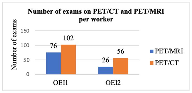 Several studies were performed on both scanners such as 18F-FDG, 68Ga-PSMA, 11C-PIB, 11C-PK11195. The most frequent study procedure on the PET/MRI was brain scans using 18F and 11C-labeled pharmaceuticals, and head-to-thighs standard oncologic procedure with 18F-FDG on the PET/CT. Overall, one-hundred two studies were performed on the PET/MRI while one-hundred fifty-eight studies were performed on PET/CT during the period of this study. The Figure 2 show the number of examinations performed on the PET/MRI and PET/CT scanners by each worker.