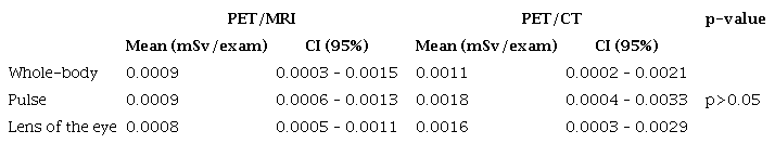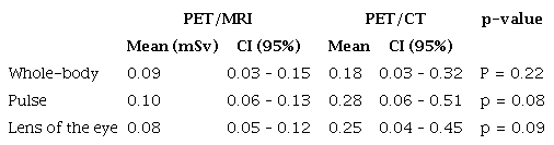 The Table 1 shows the estimation of dose for whole-body, pulse and lens of the eyes of both workers. In such evaluation, we found no statistical difference neither for whole-body (p = 0.22), pulse (p = 0.08) or lens of the eyes (p = 0.09) between the working time on PET/MRI and PET/CT.