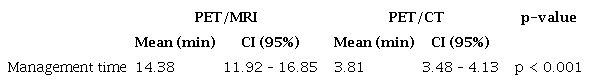 The time of patient management during the PET/MRI and PET/CT studies were recorded by the OEIs during the procedure, and it included only the time of positioning and removing the patient from each bed scanner.