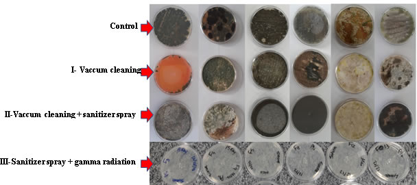 The methods of vacuum cleaning and sanitizer spray with denatonium benzoate were not efficient to fungal control. The association with radiation, 17 kGy, showed that 80% of samples were completely decontaminated.