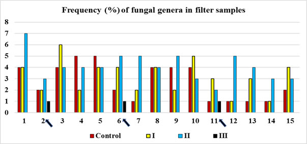 The vacuum cleaning treatment (I) samples showed 11 fungal genera and NSF. The same 10 genera found in control samples, but with two more such as Mucor spp. and Nigrospora spp. The cleaning and chemical treatment samples (II) showed 10 fungal genera (with one UFC of NSF.). The treatment I resulted in more fungal contamination in 46.6 % of samples, comparing with control samples. However, the samples treated by vacuum cleaning and sanitizer spray (II) showed the increase of fungal counting in ten samples (66 %).