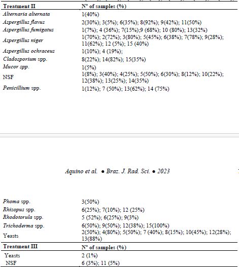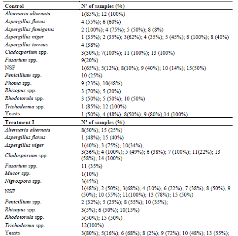 The control samples showed were contaminated with a diversity of 10 genera and Not Sporulated Fungi (NSF). The results of the control group (0 kGy) demonstrated the presence of Alternaria alternata, Aspergillus flavus, Aspergillus fumigatus, Aspergillus niger, Aspergillus terreus, Cladosporium spp., Fusarium spp., yeasts, Penicillium spp., Phoma spp., Rhizopus spp., Rhodotorula spp. and Trichoderma spp.