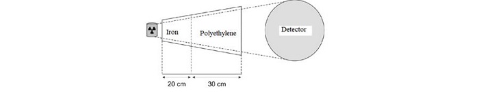This method has been widely used in the evaluation of scattering, as it is considered simple compared to other methods, allowing direct measurement. For the application of this method, in Annex E of the ISO 8529-2 standard [13], there is a recommendation for the use of a cone composed of neutron-absorbing material (borated polyethylene) and solid iron, with the rear part which is close to the source, that must be made up of 20 cm of solid iron and the front part of 30 cm of borated polyethylene. In Figure 1 a diagram of the Shadow Cone Method is presented [13].