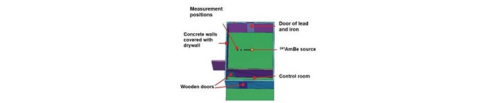 The Neutron Calibration Laboratory (LCN) has lateral dimensions of 6.88 m x 5.46 m and walls of concrete 15 cm thick. The laboratory is 2.8 m high, the concrete ceiling is 15 cm thick, and the granite floor is 5 cm thick. The 241AmBe source is positioned in the center of the laboratory at a height of 1.4 m. Figure 3 shows the Neutron Calibration Laboratory of IPEN and the structural laboratory geometry, where the MCNPX was applied.