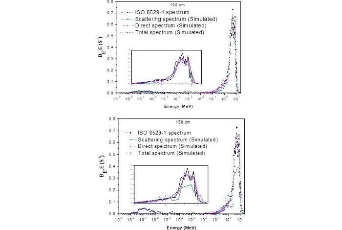 Initially the neutron spectra were obtained. Figure 4 shows the direct, scattered and total neutron fluence spectra, obtained via simulation at the source-detector distances of 100 cm and 150 cm at LCN, together with the reference spectrum of ISO 8529-1 [20], which has a maximum uncertainty in the energy bins of 3%.